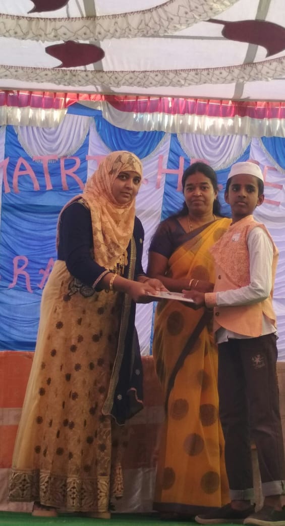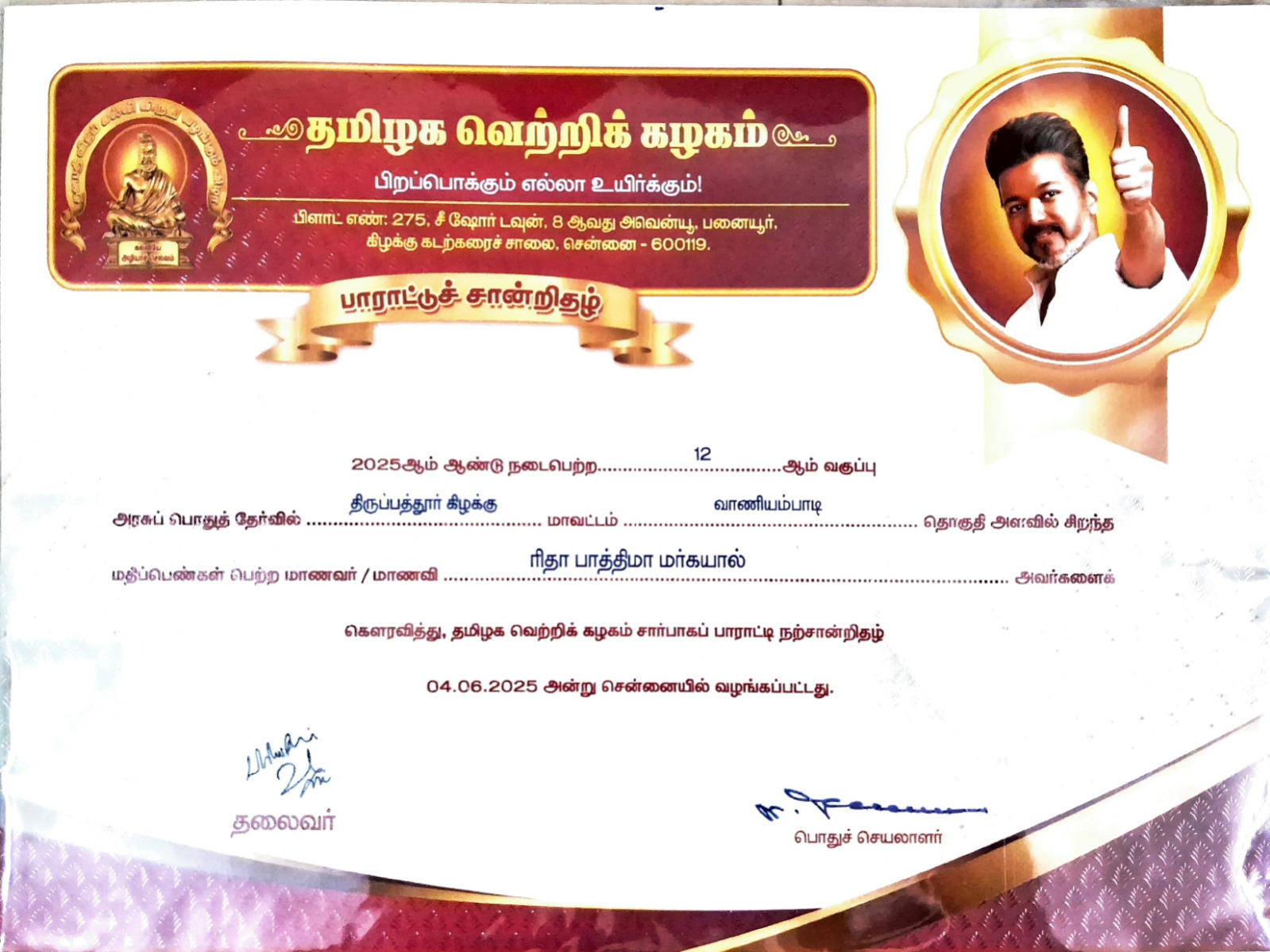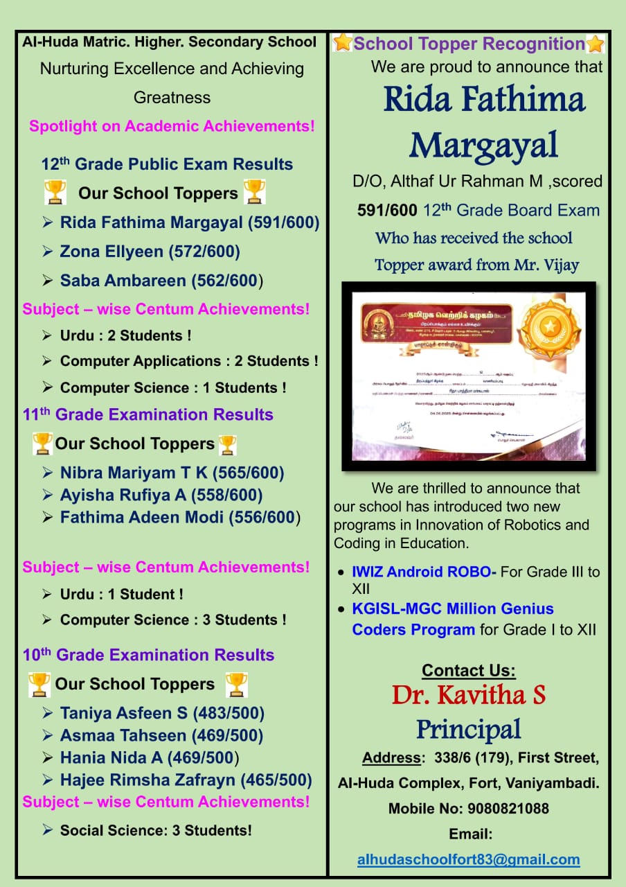 We are proud to announce that Rida Fathima Margayal scored 591/600 12th Grade Board Exam Who has received the school Topper award from Mr. Vijay